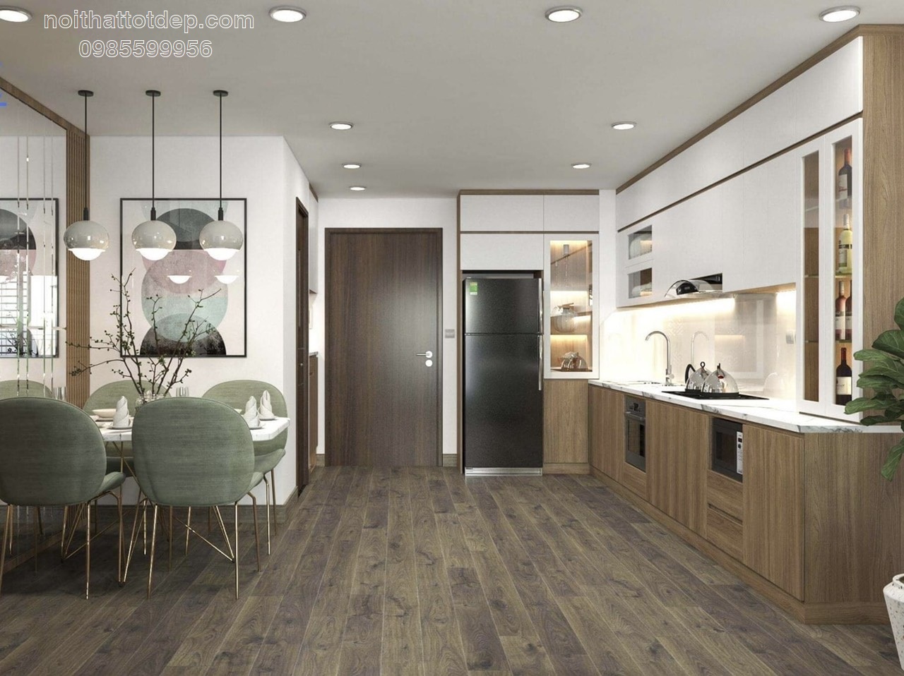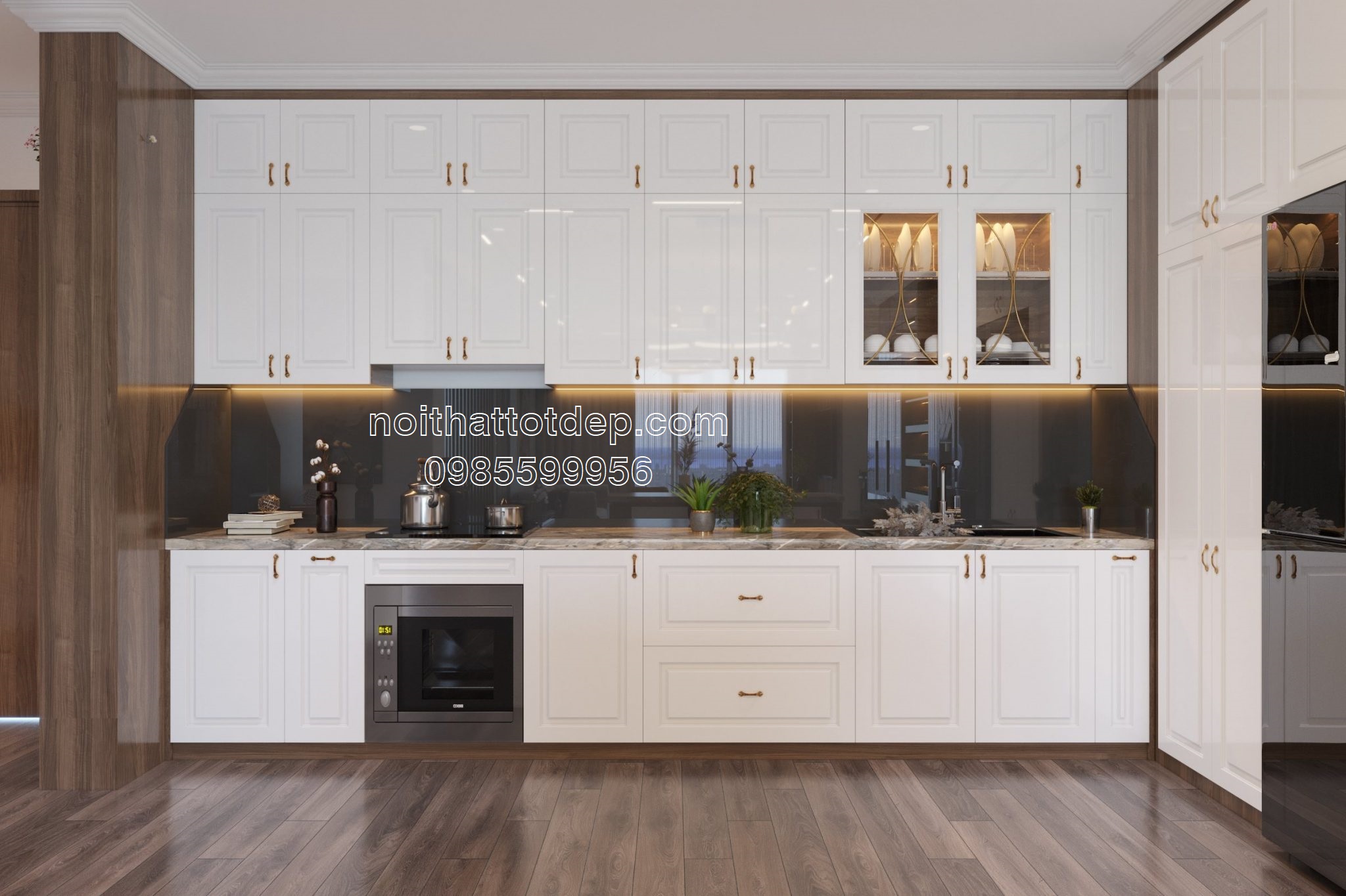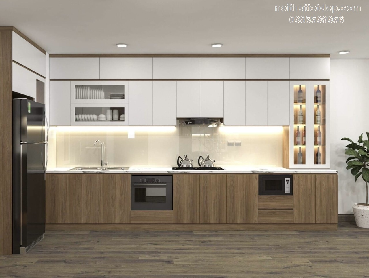 * Lưu ý: Nếu như đủ kinh tế, khuyên bạn nên đóng thêm hệ tủ trên, còn nếu thấp quá nên hạ trần thạch cao xuống sát với nóc tủ.