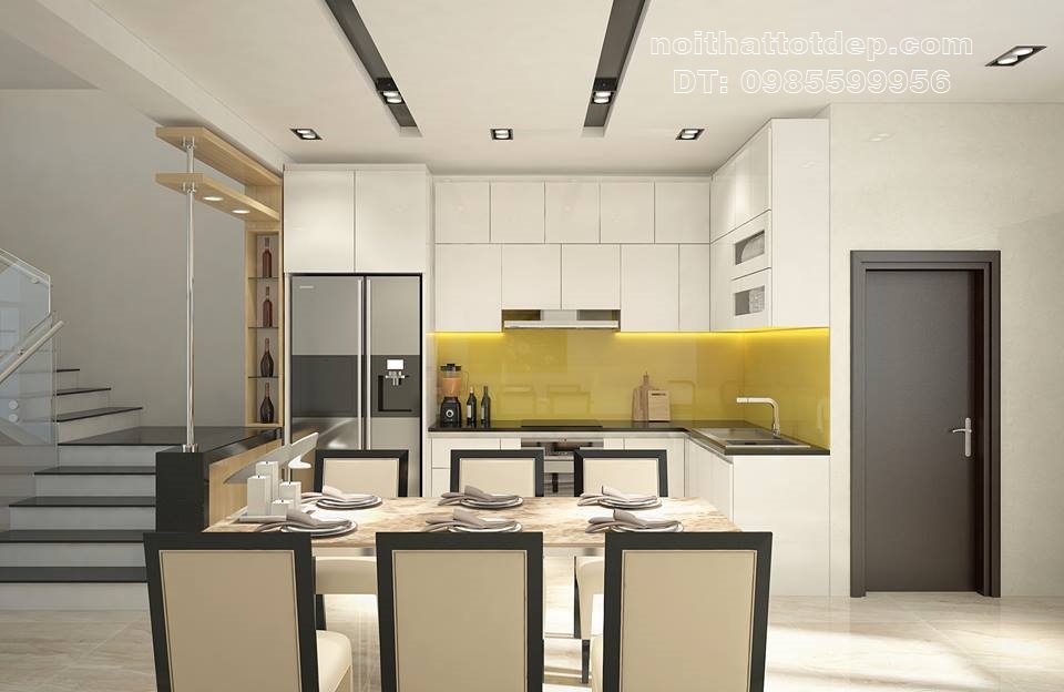 - Phòng bếp nhà ống thường thiết kế theo dạng chữ U hoặc chữ L với hệ thống tủ bếp và trang thiết bị hiện đại. Nội thất nhà bếp càng đơn giản gọn gàng sẽ càng mang đến bầu không khí thoải mái, thuận tiện cho người sử dụng. Với đặc trưng nhà phố là hẹp và dài, không thể dành hẳn một không gian sắp xếp bàn ăn riêng biệt. Các kiến trúc sư thường chọn giải pháp đặt bàn ăn cạnh bếp. Lưu ý trong phòng ăn cần hạn chế máy móc (tivi, máy tính hay các thiết bị nghe nhìn khác). Những thiết bị này vừa có từ tính, sẽ làm mất tập trung cho bữa ăn, nhất là đối với trẻ em.